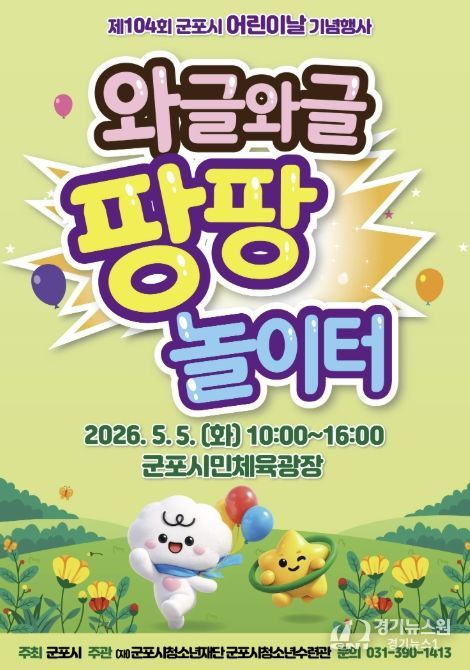 [경기뉴스원/경기뉴스1] | 군포시는 제104회 어린이날을 맞아 오는 5월 5일 오전 10시부터 오후 4시까지 군포시민체육광장에서 ‘와글와글 팡팡 놀이터’를 주제로 어린이날 기념행사를 개최한다.