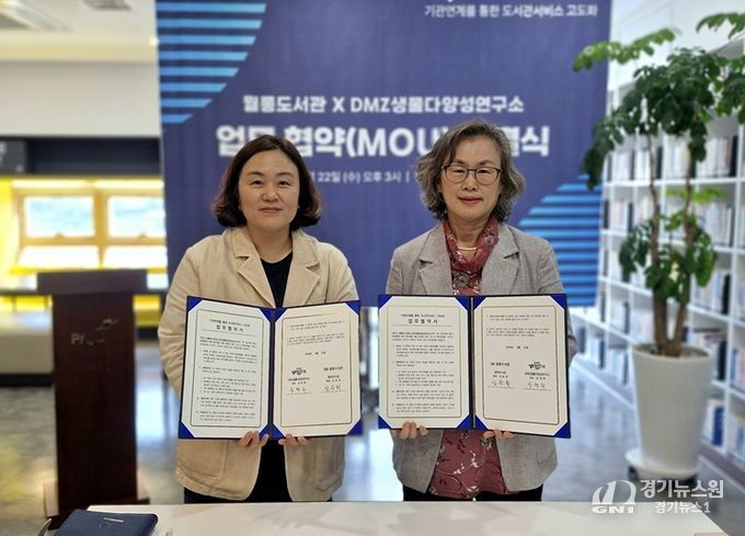 [경기뉴스원/경기뉴스1] | 파주시 월롱도서관은 지난 22일 디엠지(DMZ)생물다양성연구소와 지역사회 독서진흥 및 생태환경 분야 협력을 위한 업무협약을 체결했다.