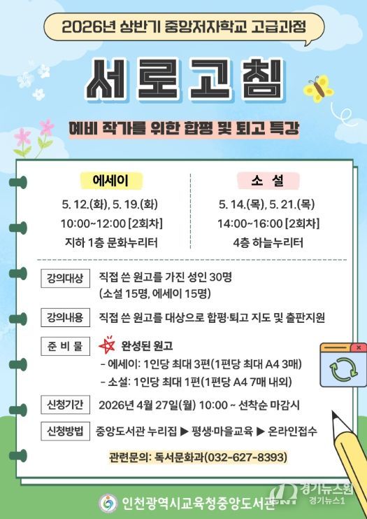 [경기뉴스원/경기뉴스1] | 인천광역시교육청중앙도서관은 4월 27일부터 예비 작가를 위한 ‘중앙저자학교 고급과정’ 참여자를 모집한다.