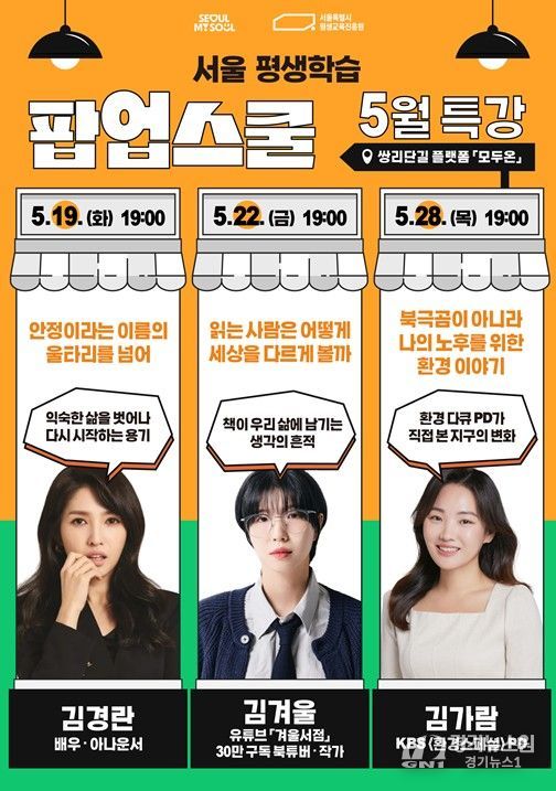 [경기뉴스원/경기뉴스1] | 서울특별시평생교육진흥원이 지난 4월 도봉구 쌍문역 인근에 개관한 서울시 첫 역세권 평생학습 거점 ‘서울 평생학습 팝업스쿨’을 확대 운영한다. 시범운영 한 달간 500여 명이 참여했으며, 5월에는 정규강좌, 명사특강, 러닝숍 등 3개 영역에서 총 13개 과정을 편성하고, 650명의 시민 참여를 목표로 한다.