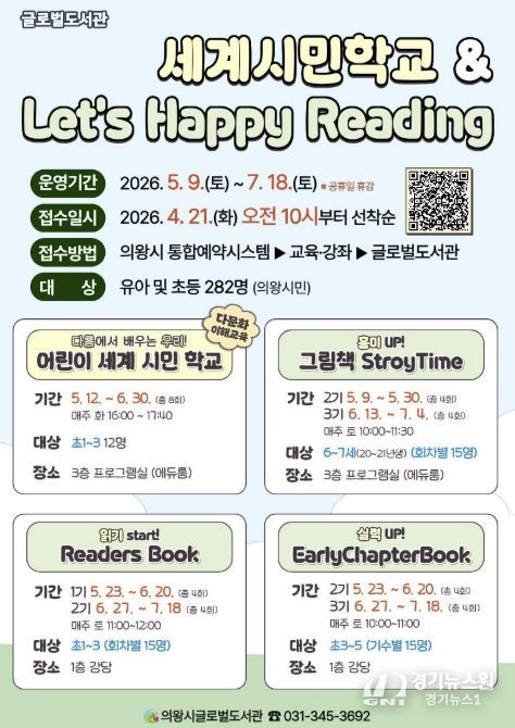 [경기뉴스원/경기뉴스1] | 의왕시 글로벌도서관이 책을 통해 세상을 이해하고 체험하는 다문화 이해 프로그램 '어린이 세계 시민 학교'와 영어 읽기 문해력 향상을 위한 단계별 맞춤 프로그램 'Let’s Happy Reading'의 참여자를 모집한다.