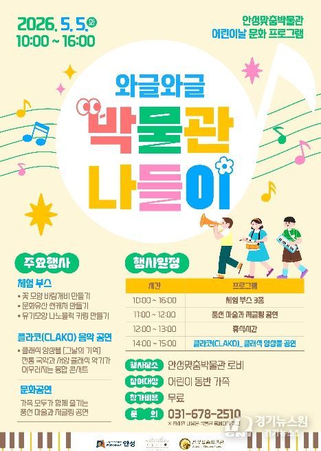 [경기뉴스원/경기뉴스1] | 안성맞춤박물관은 오는 5월 5일 어린이날을 맞아, 온 가족이 함께 즐길 수 있는 문화 프로그램 ‘와글와글 박물관 나들이’를 개최한다고 밝혔다.