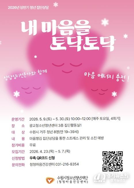 [경기뉴스원/경기뉴스1] | 수원시청소년청년재단 청청마음건강센터는 학업과 취업준비, 직장생활 등 경쟁 중심 환경으로 인해 심리적 소진을 겪는 관내 청년들을 대상으로, 오는 5월 7일까지 전문가가 참여하는 집단상담 프로그램 ‘내 마음을 토닥토닥’ 참가자를 모집한다고 밝혔다.