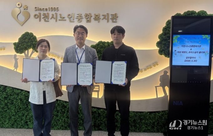 [경기뉴스원/경기뉴스1] | 이천시는 지난 4월 23일, 이천시 노인종합복지관에서 대성태권도과와 프리스실라 플라워와 함께 지역사회 어르신들의 복지 증진과 통합적 지원 체계 구축을 위한 ‘어르신 문화체육 이음터사업’ 업무협약(MOU)을 체결했다고 밝혔다.