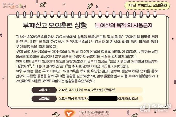 [경기뉴스원/경기뉴스1] | 수원시청소년청년재단은 임직원의 부패 상황 인지 및 신고 역량을 강화하고 조직 내 청렴문화를 확산하기 위해 '2026년 부패신고 모의훈련'을 실시했다고 밝혔다.