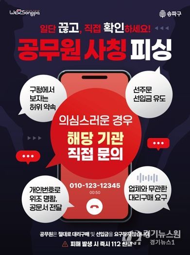 [경기뉴스원/경기뉴스1] | 서울 송파구가 공무원 사칭 사기에 맞서 사례 발생 즉시 계약업체에 알리고 전 부서와 경찰까지 연결하는 대응 체계를 가동한다고 26일 밝혔다.