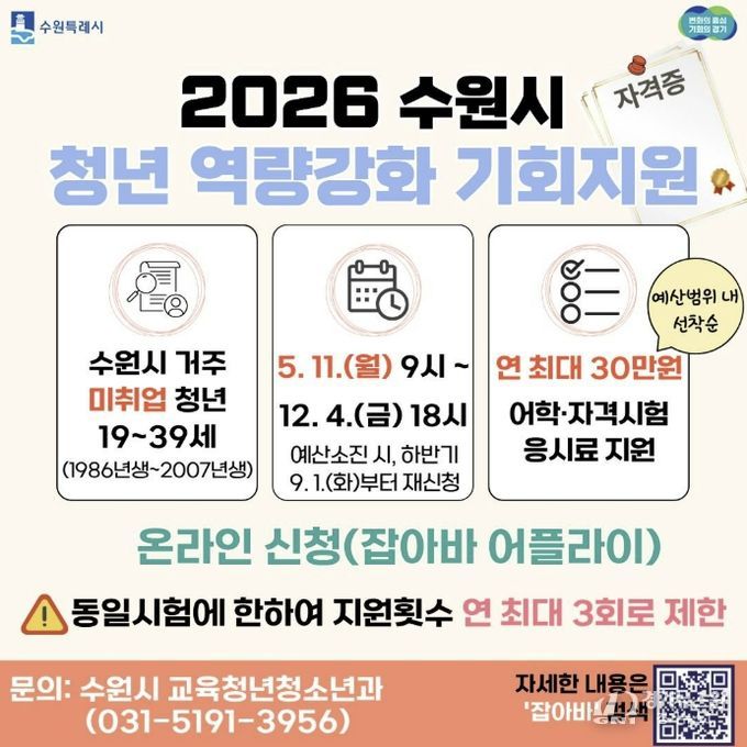 [경기뉴스원/경기뉴스1] | 수원특례시는 미취업 청년의 취업 준비 비용 부담을 덜어주는 ‘청년 역량강화 기회 지원 사업’을 12월 4일까지 운영한다. 미취업 청년에게 어학·자격시험 응시료를 1인당 연 최대 30만 원 지원한다.