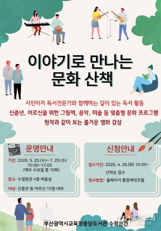 [경기뉴스원/경기뉴스1] | 부산광역시립중앙도서관은 오는 5월 20일부터 7월 29일까지 매주 수요일마다 중앙도서관 수정분관에서 신중년 및 어르신 15명을 대상으로 ‘이야기로 만나는 문화 산책’ 프로그램을 운영한다.