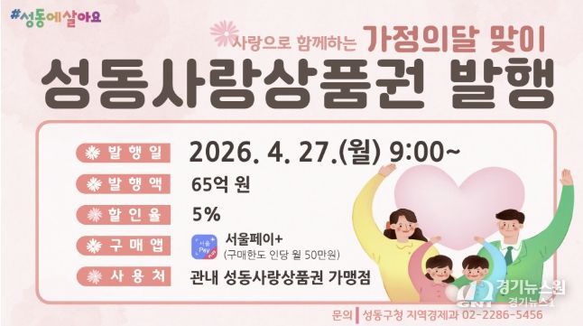[경기뉴스원/경기뉴스1] | 서울 성동구는 고물가로 위축된 소비 심리를 회복하고 지역경제에 활력을 불어넣기 위해 총 65억 원 규모의 성동사랑상품권을 추가 발행한다고 밝혔다.