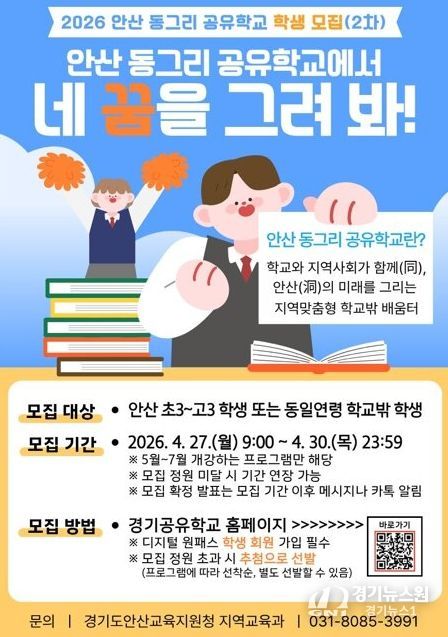 한편 안산교육지원청은 오는 30일까지 나흘간 약 50개 과정, 900여 명 규모의 ‘안산 동그리 공유학교’ 2차 참여 학생을 모집한다. 참여를 희망하는 경우 경기공유학교 누리집에서 신청할 수 있다.