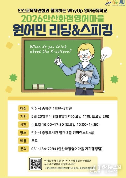 이번 프로그램은 ‘안산 동그리 공유학교’를 기반으로 운영되는 WhyUp 영어공유학교 사업의 일환으로 추진된다. 참가 신청은 27일 오전 9시부터 오는 30일 오후 6시까지 경기공유학교 누리집에서 온라인으로 하면 된다.