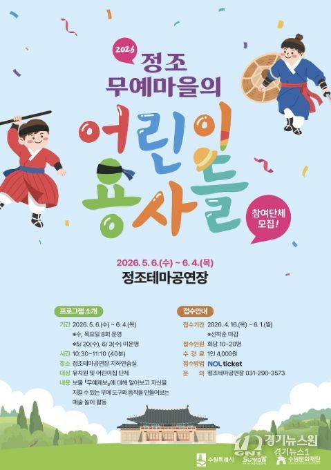 [경기뉴스원/경기뉴스1] | 수원문화재단 정조테마공연장의 대표 예술교육 프로그램 '정조무예마을의 어린이 용사들'의 상반기 교육이 접수 마감되며 큰 호응을 얻고 있다.
