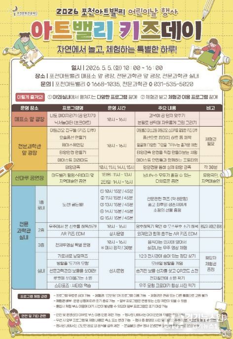 [경기뉴스원/경기뉴스1] | 포천문화관광재단이 운영하는 포천아트밸리는 오는 5월 5일 어린이날을 맞아 어린이와 가족을 위한 체험형 문화행사 ‘아트밸리 키즈데이’를 개최한다.