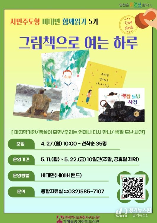 [경기뉴스원/경기뉴스1] | 인천광역시교육청서구도서관(관장 정연순)은 2026년 시민주도형 비대면 함께읽기 5기로, 5월 11일부터 5월 22일까지 ‘그림책으로 여는 하루’ 프로그램을 운영한다.