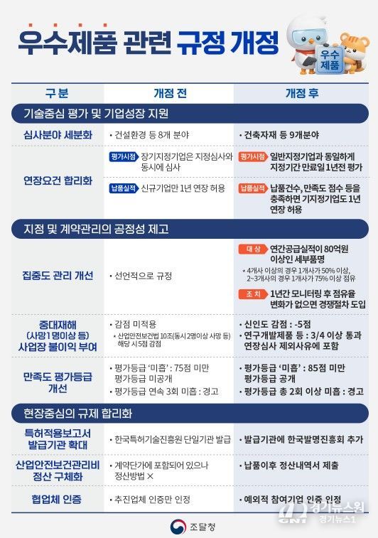 [경기뉴스원/경기뉴스1] | 조달청은 기업의 성장을 지원하고, 공정한 경쟁환경을 조성하기 위해 우수조달물품 관련 규정을 개정하여 4월 27일부터 시행한다고 밝혔다.