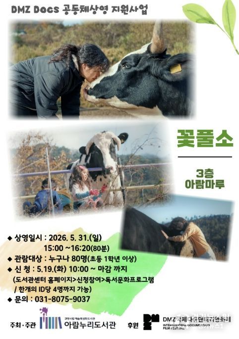 [경기뉴스원/경기뉴스1] | 고양특례시 아람누리도서관은 DMZ국제다큐멘터리영화제와 협업해 오는 5월 31일 오후 3시, 도서관 3층 아람마루에서 다큐멘터리 영화 ‘꽃풀소’ 상영회를 개최한다.