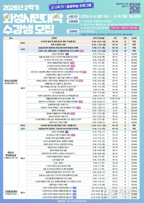 [경기뉴스원/경기뉴스1] | 화성특례시는 2026년 화성시민대학 2학기 수강생을 오는 5월 4일부터 5월 10일까지 선착순으로 모집한다고 밝혔다.