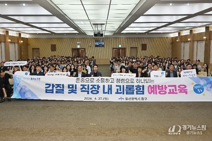 [경기뉴스원/경기뉴스1] | 울산 중구가 4월 27일 오후 2시 중구청 대회의실에서 직원들을 대상으로 ‘2026년 갑질 및 직장 내 괴롭힘 예방교육’을 실시했다.
