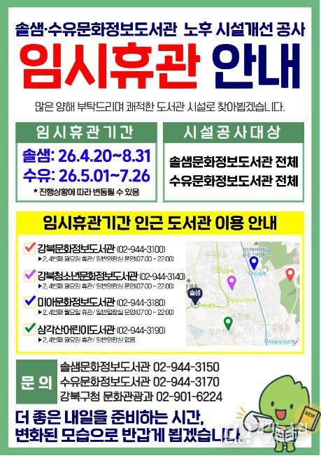 [경기뉴스원/경기뉴스1] | 서울 강북구는 구민들에게 보다 쾌적하고 현대적인 독서 환경을 제공하기 위해 솔샘문화정보도서관과 수유문화정보도서관을 순차적으로 임시 휴관한다고 밝혔다.