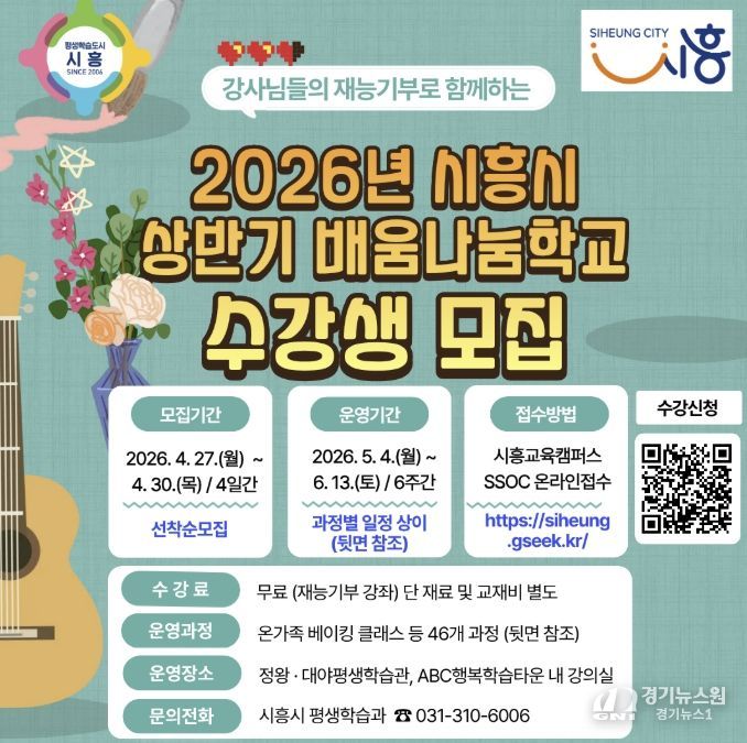 수강생 모집 기간은 4월 27일부터 4월 30일까지이며, 강좌별 모집 인원은 선착순으로 마감된다. 신청은 시흥교육캠퍼스 ‘쏙(SSOC)’을 통해 가능하며, 세부 강좌 일정과 내용은 홈페이지를 통해 확인할 수 있다.