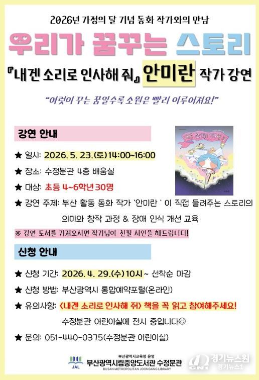 [경기뉴스원/경기뉴스1] | 부산광역시립중앙도서관은 다음달 23일 중앙도서관 수정분관에서 초등학생 4~6학년 30명을 대상으로 가정의달 기념 안미란 동화 작가와의 만남 ‘우리가 꿈꾸는 스토리’를 운영한다.