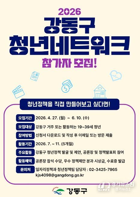 [경기뉴스원/경기뉴스1] | 서울 강동구는 ‘2026년 강동구 청년네트워크’ 참여자를 모집한다고 밝혔다. 청년네트워크는 청년들이 직접 의제를 발굴하고 정책을 제안하는 사업이다.