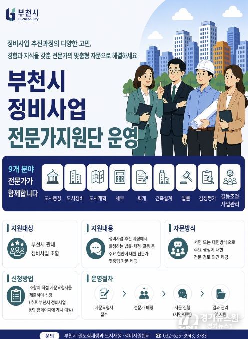 [경기뉴스원/경기뉴스1] | 부천시는 정비사업 추진 과정에서 발생하는 법률·재정·갈등 등 주요 현안에 대한 전문 자문을 지원하기 위해 ‘정비사업 전문가지원단’을 구성해 운영한다고 지난 28일 밝혔다.