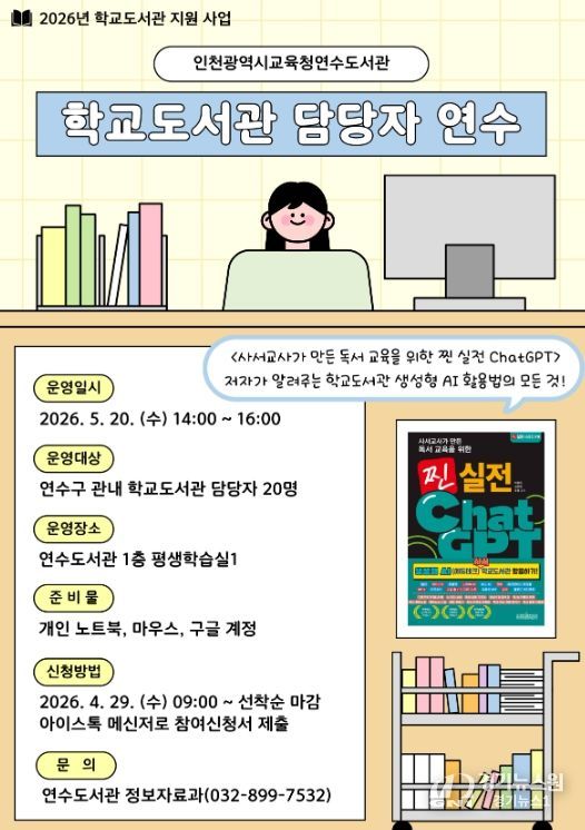 [경기뉴스원/경기뉴스1] | 인천광역시교육청연수도서관은 5월 20일 학교도서관 담당자의 실무 역량을 높이기 위한 ‘학교도서관 담당자 연수’를 운영한다.