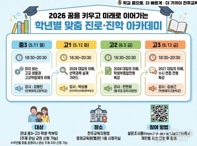 전주교육지원청은 오는 5월 11일부터 6월 12일까지 전주교육지원청 영재교육원 시청각실에서 중3~고3 학생과 학부모를 대상으로 ‘2026년 꿈을 키우고 미래로 이어가는 학년별 맞춤 진로·진학 아카데미’를 운영한다고 28일 밝혔다.