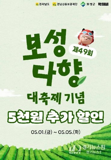 [경기뉴스원/경기뉴스1] | 보성군은 제49회 보성다향대축제를 맞아 5월 1일부터 5일간 공공배달앱 ‘먹깨비’를 활용한 추가 할인 행사를 진행한다고 밝혔다.