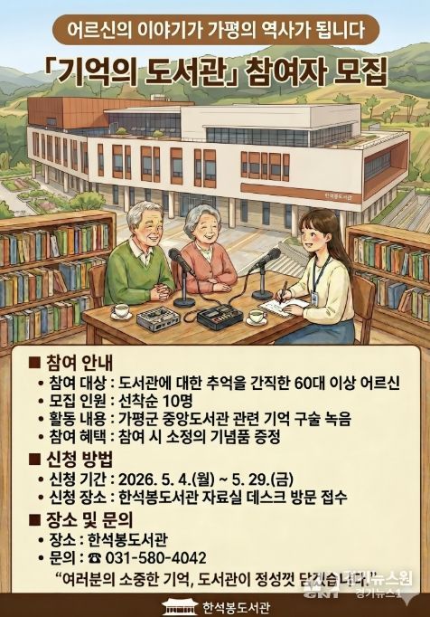 [경기뉴스원/경기뉴스1] | 가평군 한석봉도서관이 오는 5월부터 어르신들의 생생한 목소리로 지역의 옛 기록을 수집하는 ‘기억의 도서관’ 프로그램을 운영한다. 실버층 특화 사업인 ‘말랑말랑 추억 교실’의 일환으로 추진되는 이번 사업은 지역 문화 자산을 확보하고 세대 간 기억을 공유하고자 기획됐다.
