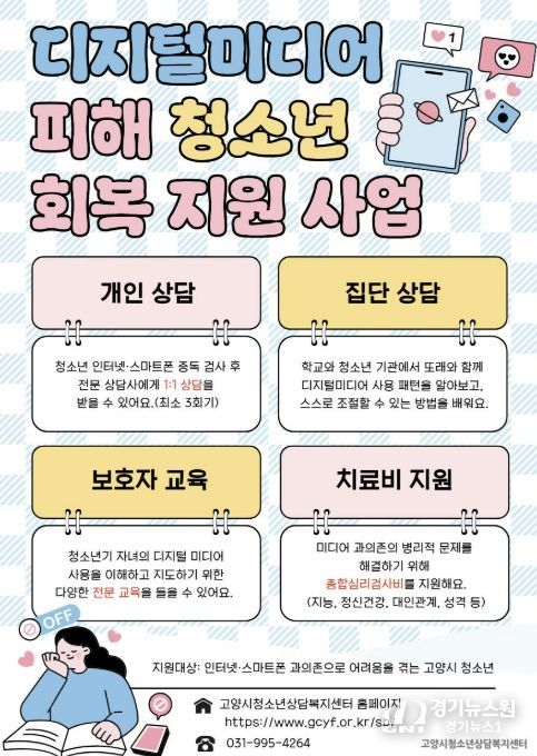 [경기뉴스원/경기뉴스1] | 고양시청소년재단 산하 고양시청소년상담복지센터는 디지털 유해환경에 의한 청소년의 디지털 과의존 및 사이버 도박 등의 사회문제를 예방하고 치료하기 위해 오는 5월부터 12월까지 ‘디지털미디어 피해 청소년 회복 지원 사업’을 운영한다고 밝혔다.