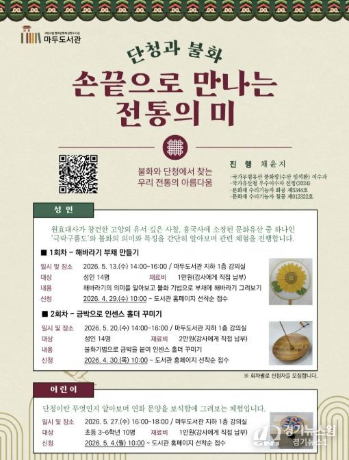 [경기뉴스원/경기뉴스1] | 고양특례시 마두도서관은 오는 5월, 단청과 불화를 주제로 우리 전통의 아름다움을 체험할 수 있는 프로그램 ‘손끝으로 만나는 전통의 미’를 운영한다.