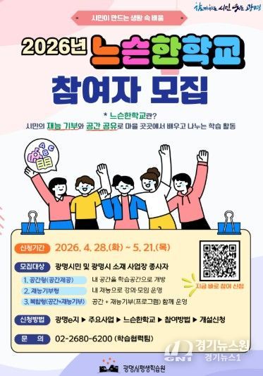 [경기뉴스원/경기뉴스1] | 광명시가 시민이 직접 가르치고 배우는 시민참여형 평생학습 프로그램 ‘느슨한학교’ 신규 운영자를 오는 5월 21일까지 모집한다.