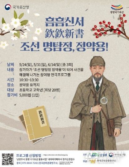 [경기뉴스원/경기뉴스1] | 남양주시는 오는 5월 24일과 31일, 6월 14일 정약용 유적지에서 초등학교 고학년을 대상으로 참여형 연극 프로그램 ‘흠흠신서: 조선 명탐정, 정약용!’ 참가자를 모집한다고 밝혔다.
