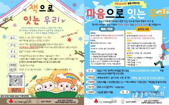 [경기뉴스원/경기뉴스1] | 꿈이 모이는 도시, 미래를 그리는 강남구가 저소득·다문화가정 아동의 건강한 정서 성장을 돕는 ‘책과 마음으로 잇는 우리’ 프로그램 참여자를 5월 3일까지 모집한다.