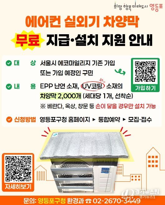 [경기뉴스원/경기뉴스1] | 영등포구가 다가오는 여름철 무더위에 대비해 구민들의 냉방비 부담을 줄이고 에너지 효율을 높이기 위한 ‘에어컨 실외기 차양막 설치 지원사업’을 추진한다고 밝혔다.