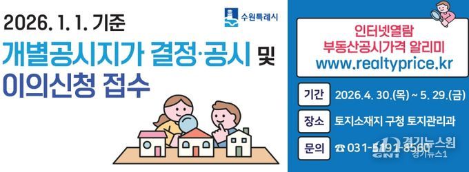 [경기뉴스원/경기뉴스1] | 수원시 영통구는 2026년 1월 1일 기준 개별공시지가를 4월 30일 결정·공시하고, 5월 29일까지 이의신청 기간을 운영한다.