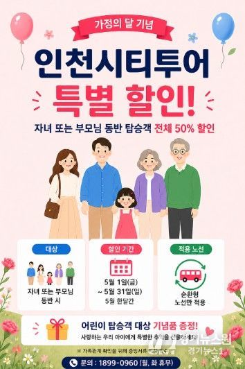 [경기뉴스원/경기뉴스1] | 인천관광공사는 5월 가정의 달을 맞아 가족 단위 관광객 유입을 확대하고 이용객의 재방문 활성화를 위한‘인천시티투어 특별 프로모션’을 실시한다고 밝혔다