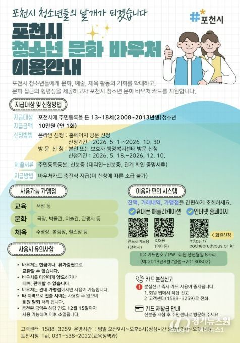 [경기뉴스원/경기뉴스1] | 포천시는 청소년의 문화 접근성을 높이고 다양한 체험 기회를 제공하기 위해 ‘포천시 청소년 문화 바우처 지원사업’을 본격 시행한다.