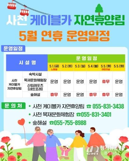 [경기뉴스원/경기뉴스1] | 사천시는 5월 가정의 달과 어린이날을 포함한 연휴 기간을 맞아 사천케이블카 자연휴양림의 이용객 편의를 위한 시설별 5월 연휴 운영 계획을 안내했다.