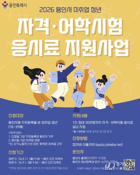 [경기뉴스원/경기뉴스1] | 용인특례시는 취업을 위해 어학과 자격증 시험 등을 준비 중인 청년을 위해 응시료 30만 원을 지원한다고 30일 밝혔다.