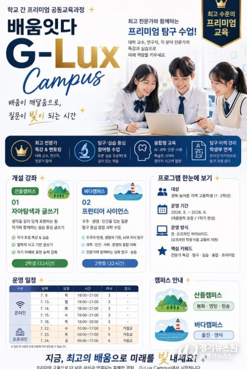 [경기뉴스원/경기뉴스1] | 경북교육청은 농어촌 지역 고등학생의 과목 선택권 확대와 진로 탐색 기회 강화를 위해 학교 간 프리미엄 공동교육과정인 ‘배움잇다: 룩스(Lux) 캠퍼스’를 운영하고, 오는 5월 14일까지 참여 학생을 모집한다고 밝혔다.