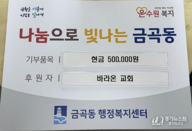 [경기뉴스원/경기뉴스1] | 수원시 권선구 금곡동 행정복지센터는 관내 바라온교회에서 조손가정을 위한 성금을 후원받았다고 밝혔다.