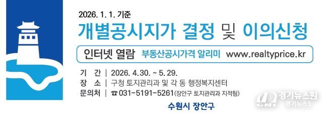 [경기뉴스원/경기뉴스1] | 수원시 장안구는 2026년 1월 1일 기준 장안구 관내 26,934필지에 대한 개별공시지가를 4월 30일에 결정·공시하고, 다음 달 29일까지 이의신청 접수를 받는다고 밝혔다.