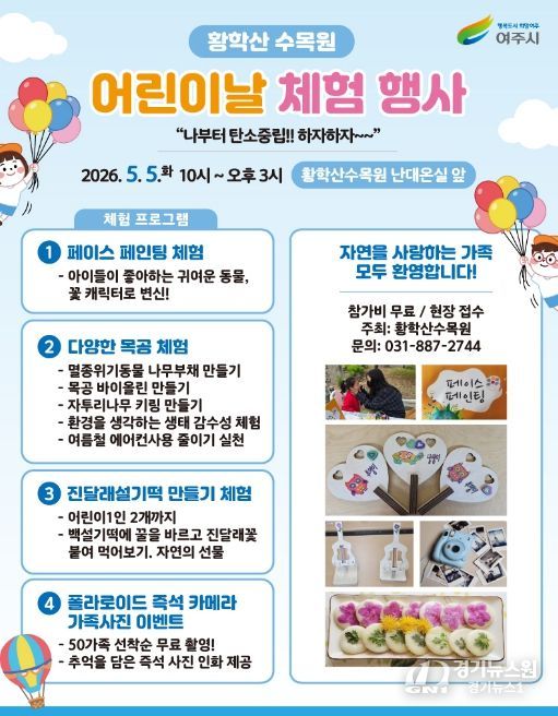 여주시 관계자는 “이번 어린이날, 황학산수목원의 푸른 자연 속에서 아이들이 마음껏 웃고 즐기며 자연과 한층 더 가까워지는 시간이 되길 바란다”며 “앞으로도 가족이 함께 소통하고 힐링할 수 있는 다양한 산림 문화 프로그램을 지속적으로 마련하겠다”고 밝혔다.