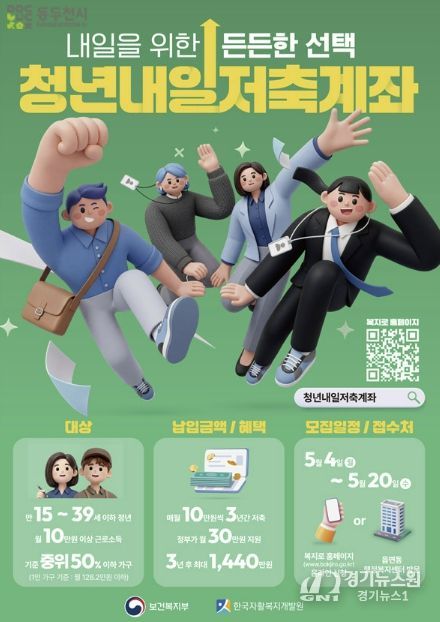 [경기뉴스원/경기뉴스1] | 동두천시는 5월 4일부터 20일까지 일하는 청년들의 경제적 자립을 돕기 위해 ‘청년내일저축계좌’ 신규 가입자를 모집한다.