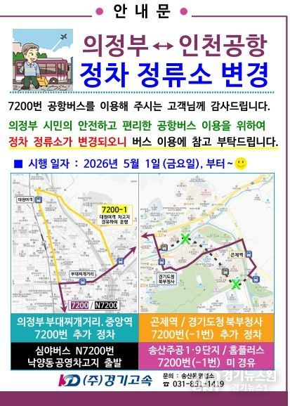 [경기뉴스원/경기뉴스1] | 의정부시는 7200번 공항버스 노선을 조정해 경로 변경 등 개선 조치를 완료했다. 이는 운수업체 경영악화 해소를 위한 노선 효율화의 일환으로, 시는 노선 개편 과정에서 발생할 수 있는 문제를 점검하기 위해 경기도 및 운수업체와 함께 최근 현장 실사를 실시했다.