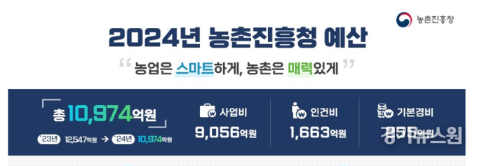 농촌진흥청(청장 조재호) 2024년 예산이 올해(1조 2,547억 원)보다 1,573억 원(12.5%) 감소한 1조 974억 원*으로 확정됐다.