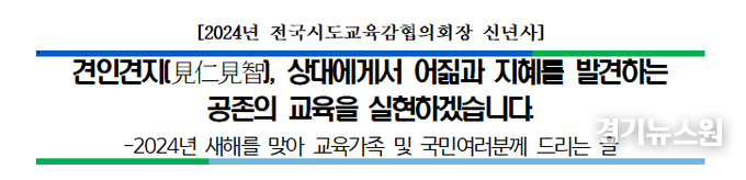 2024년 새해에도 전국의 17명 시도교육감은 때로는 각자 위치에서, 때로는 같은 위치에서 힘과 마음을 모아 학교교육의 발전과 우리 사회의 미래를 열어나가기 위해 최선의 노력을 다하겠습니다.
